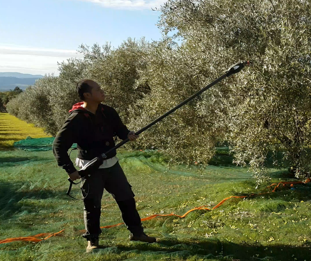 Nous débutons généralement la récolte des olives à partir du mois de novembre afin d’obtenir un rendement de production d’huile satisfaisant tout en conservant l’ardence naturelle du fruit. Pour ce faire, nous utilisons un peigne électrique. Il s’agit d’un outil léger qui consiste à secouer les rameaux de l’arbre pas des tiges métalliques avec un mouvement elliptique, conduisant ainsi à la chute de l’olive. La récolte s’en trouve considérablement accélérée tout en respectant l’arbre. Au sol sont étalés de larges filets qui recueillent les fruits. Des bouts de rameaux ainsi que des feuilles s’y retrouvent, raison pour laquelle une personne doit intervenir pour retirer les éléments indésirables. Les olives sont ensuite rassemblées puis reversées dans des caisses qui seront elles-mêmes vidées dans un palox (une caisse-palette pouvant recevoir environ 350 kg d’olives).