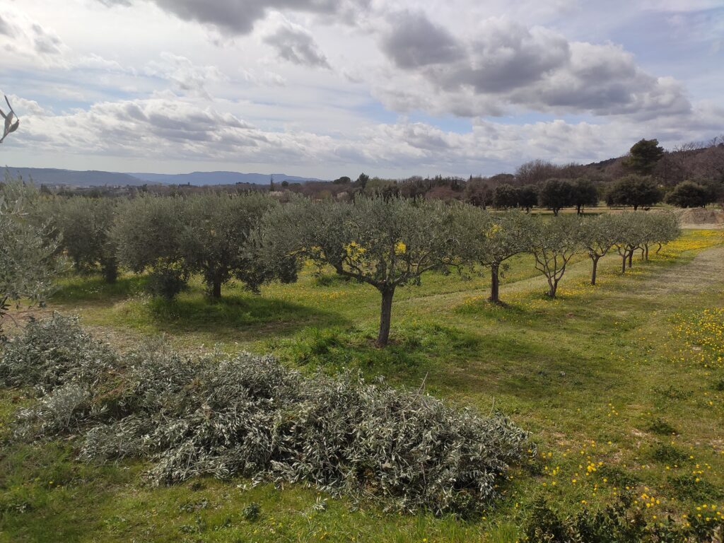 Si nous avons le temps, nous assurons également une taille des arbres afin de : ne pas faire monter l’arbre trop haut, ramener la pousse des fruits au plus près du tronc et limiter l’alternance de production. Une taille sévère peut ainsi être réalisée occasionnellement afin de restructurer l’arbre mais le travail de taille consiste généralement à supprimer le surplus de bois et les rejets afin de fortifier l’arbre. La taille doit être faite avec parcimonie, réflexion et stratégie : en effet, l’olive ne se développe pas sur les rameaux qui ont poussé dans l’année. Une taille importante induira donc une production d’olives faible voire nulle.